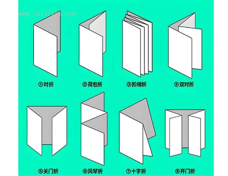 折页设计的类型大概有以下几种:1、对折 2、荷包折 3、阶梯折 4、爽对着 5、关门折 6、风琴折 7、开门折